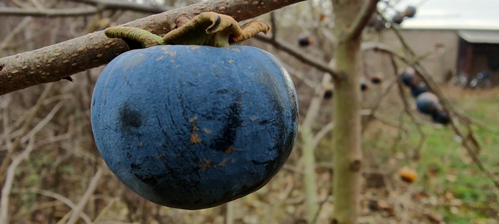- If you want to plant persimmons in colder areas and you care about quality ( size and taste) of the fruits, the Nikitas Gift and NB NO2 varieties are the best choice. A fully ripe fruit has a blue to blue-violet color and red flesh.