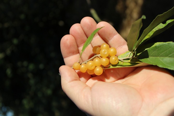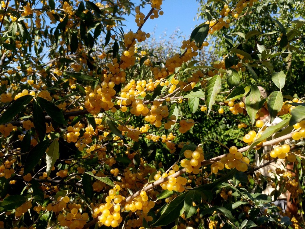 - The original range of autumn olive (Elaeagnus umbellata) was in China and Japan. In many countries, including England and the USA, it has become very popular as one of the best multifunctional shrubs for establishing edible fruit forests on poorer soils. The yellow fruits are perhaps the most attractive part of this shrub. They grow in clusters on both younger and older branches. They taste sweet and aromatic, and most people immediately like them. They can be eaten raw in large quantities and often, unlike sour currants or tart chokeberries. They are very attractive to forest animals and birds. They ripen from late September to early November and contain one large seed. They need to be left to ripen properly to get rid of their tartness. They even remain on the bush after the first winter frosts, and their taste improves. The autumn olive bush grows to a height of up to 4 m and a similar width, but often remains smaller and is quite frost-resistant. In some extreme winters, one of several bushes may freeze partially or completely above ground, but it will sprout again from the base of the stem. This species is often bred, and there are commercial cultivars not only with larger fruits but also with different growth patterns. It blooms with small white-yellow flowers from late May to June and usually escapes late spring frosts. The inconspicuous flowers are self-pollinating and pollinated by bees. They smell wonderful!