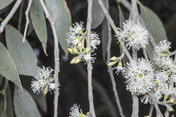 - It has rough bark on the lower part of the trunk, smooth greenish bark above, lanceolate to elliptical leaves, flower buds in clusters of nine to fifteen, white flowers, and cup-shaped or shortened spherical fruits.